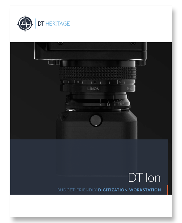 The DT Ion is a budget-friendly digitization workstation for flat, loose, bound, and reflective materials. It includes a DT Phase One RC100 100MP imaging system, an American-made, high-quality copystand, the innovative DT AutoColumn, two DT Photon MkII lights with the DT Smart Controller, and Capture One CH, providing a complete digitization solution for under $70,000